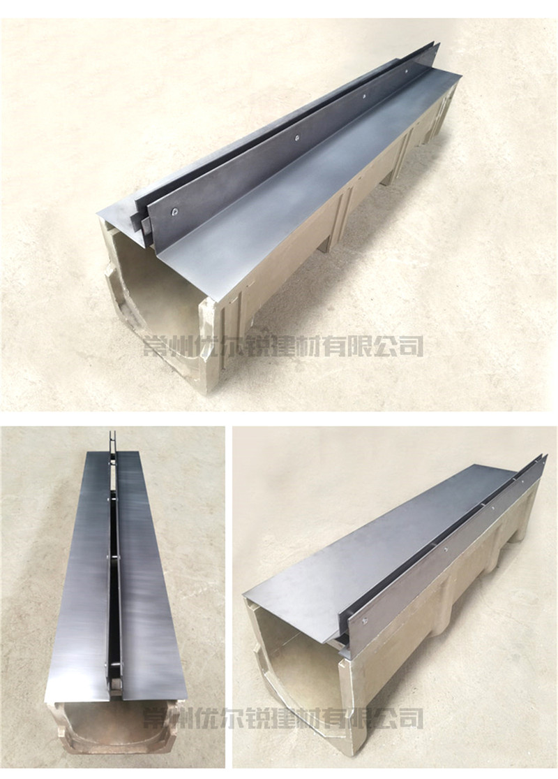 ?。?)樹(shù)脂排水溝表面光滑,具有藝術(shù)品的外觀,維護(hù)保養(yǎng)容易:樹(shù)脂混凝土排水溝表面不起砂、光滑,可以根據(jù)不同的需求,添加不同的色料,制造出不同外表顏色的產(chǎn)品來(lái),甚至可以根據(jù)要求進(jìn)行表面電鍍。表面不易堆積沉淀物,容易沖洗而且不會(huì)刷壞。